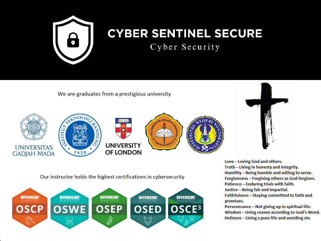 - Pengajar : Yohanes Nugroho, S.T, M.T, MSc, OSCP, OSWE, OSEP, OSED, OSCE3